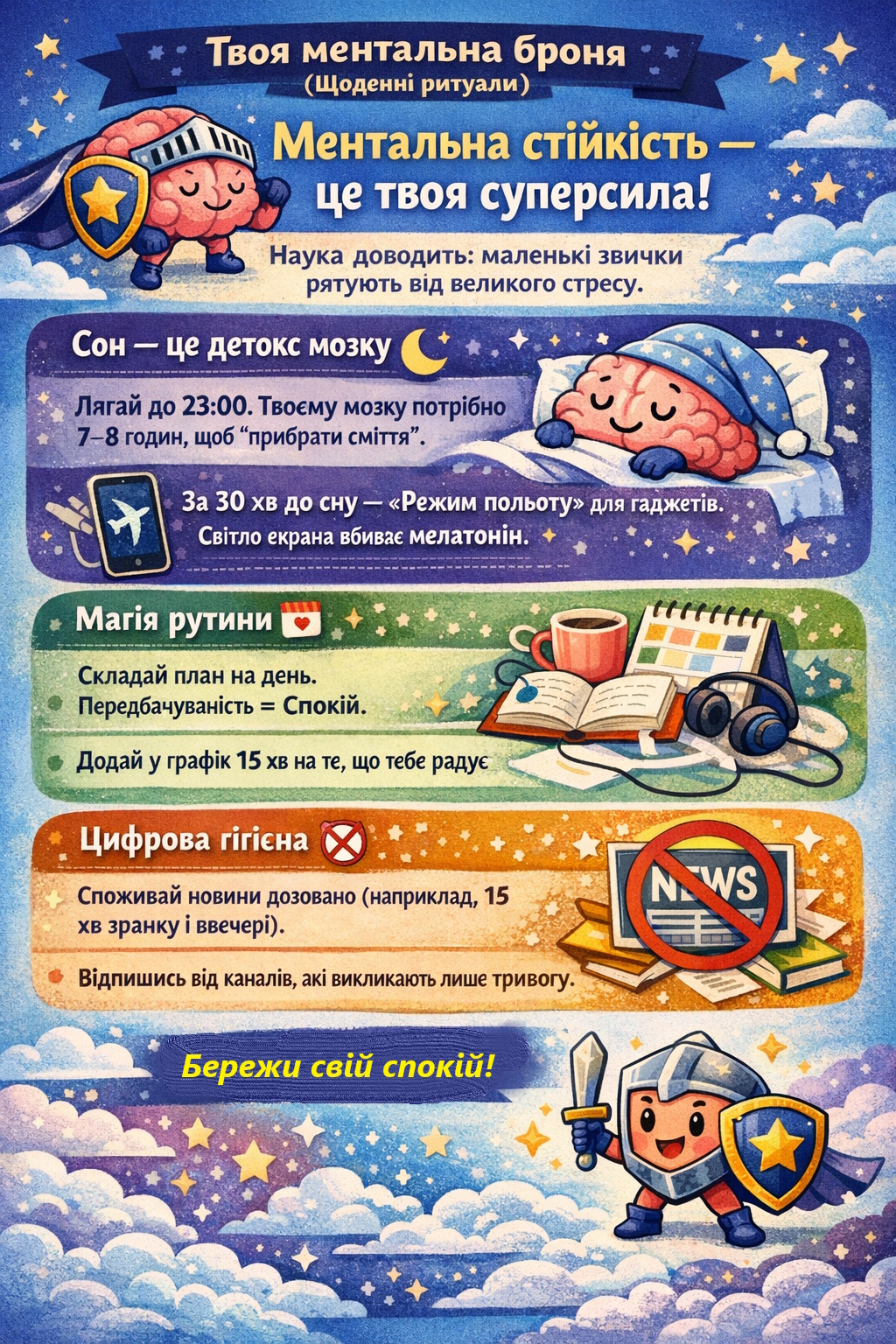 - Психічна стійкість. Ментальне здоров’я так само важливе, як і фізичне. Вміння керувати стресом, повноцінний сон (7–9 годин) та цифрова гігієна є фундаментом для запобігання вигоранню та депресії.