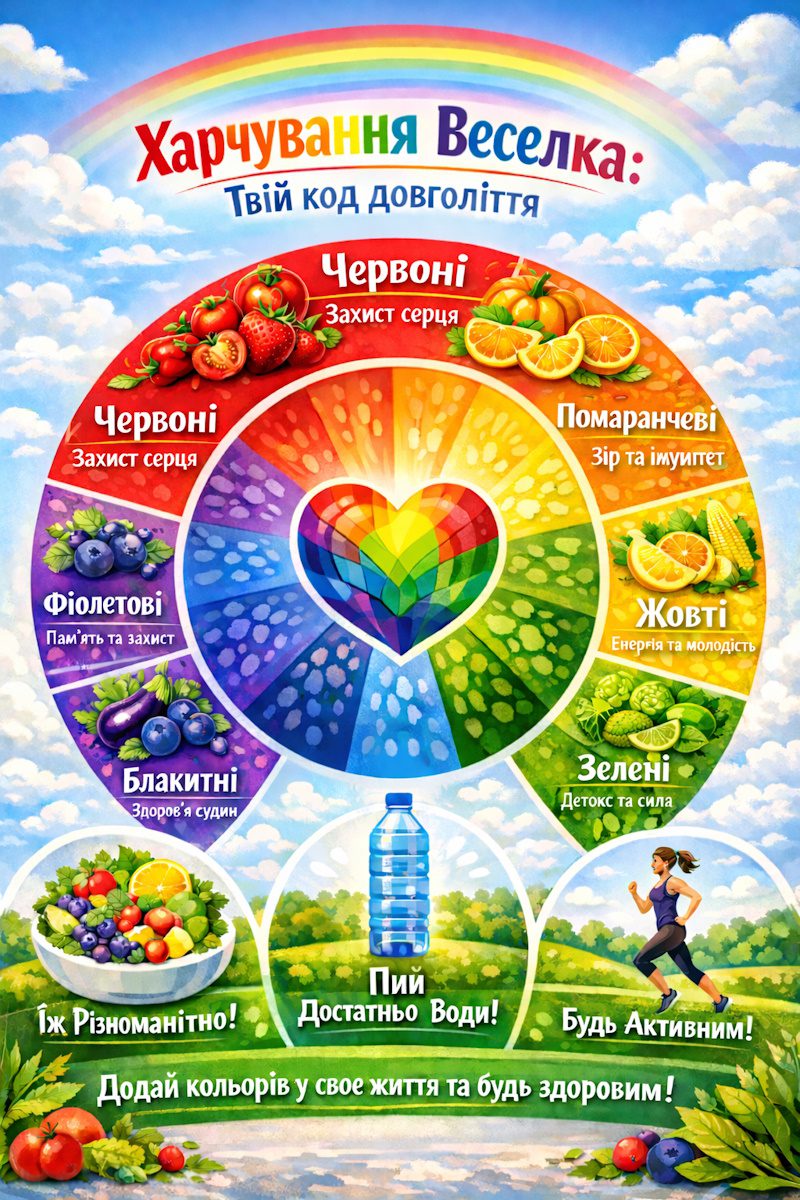 Харчування «Веселка» або Rainbow Diet – це дієтологічна стратегія, яка базується на вживанні різнокольорових рослинних продуктів протягом дня. Сьогодні цей підхід вважається одним із найефективніших методів нутриціологічної профілактики раку, оскільки колір овоча чи фрукта вказує на вміст конкретних фітонутрієнтів (природних захисників клітин).